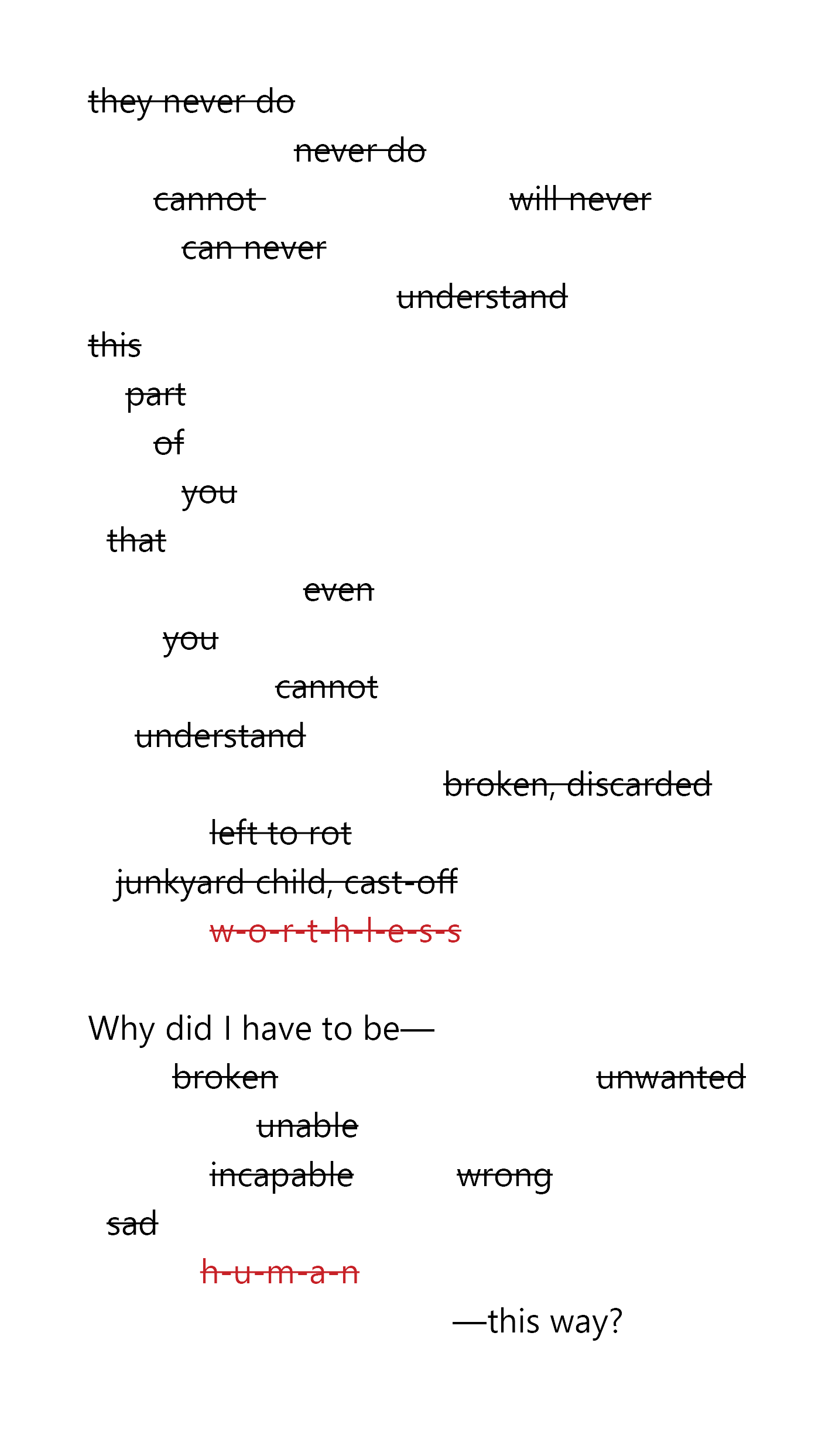 —I’m alone, so fucking alone. A whole elementary school, and I’m alone, because the only times I’m not alone I’m attacked, relentlessly. I don’t have a single friend in this godforsaken place, the teachers don’t even try to protect me anymore, and despite the fact that I’m a fifth grader now, even the first-graders harass me because I’m profoundly weird, the kid that doesn’t make sense to anyone, the broken one, the queer (nobody knows, myself least of all), not really human, the one that must be cast out, the—